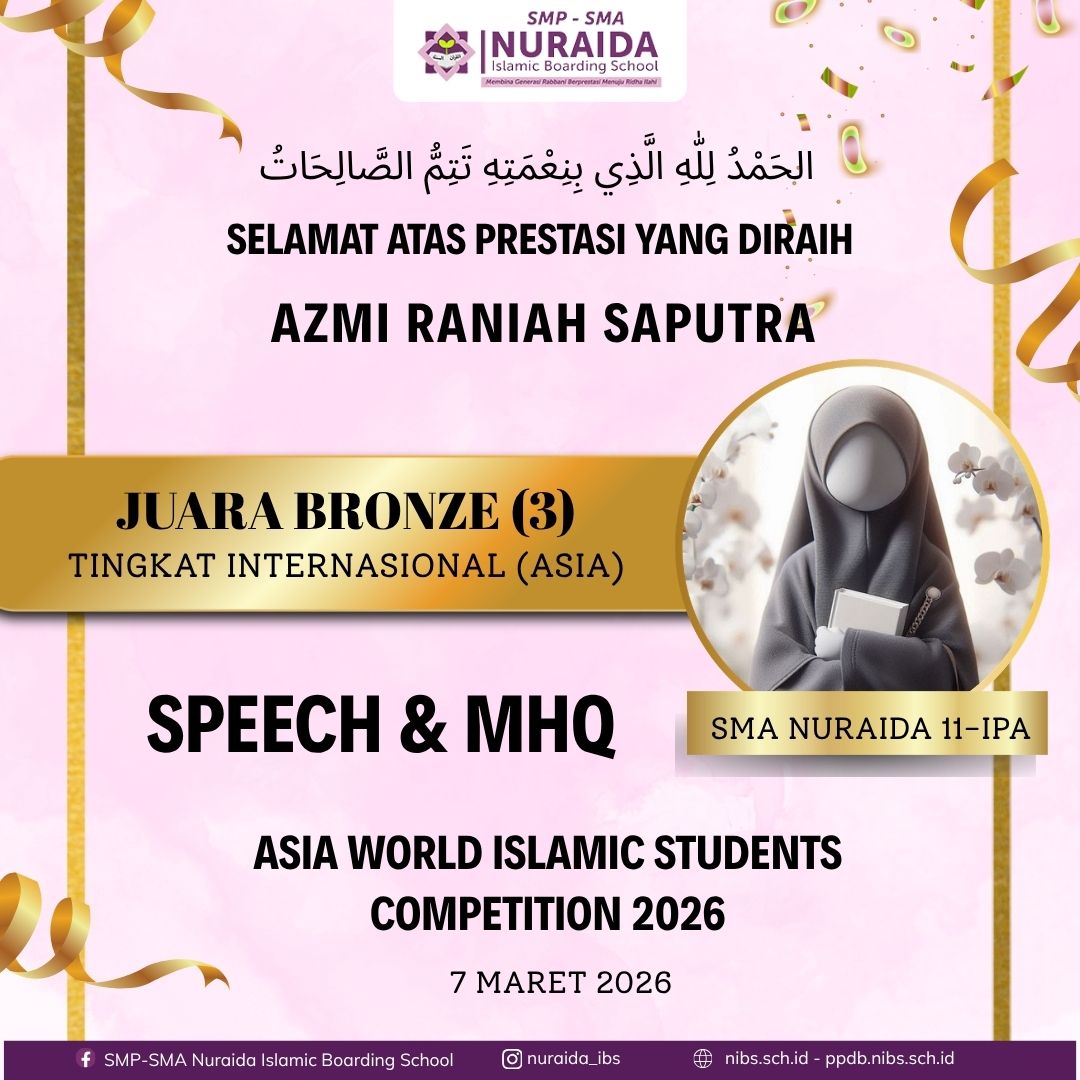 Selamat kepada Ananda Azmi Raniah Saputra (kelas 11 IPA) atas prestasinya sebagai Juara Bronze (3) dalam kategori Speech & MHQ pada ajang ASIA WORLD ISLAMIC STUDENTS COMPETITION 2026 tingkat Internasional (Asia) 🌏