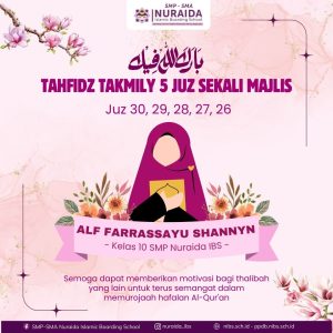 Alhamdulillah ananda Alf Farrassayu Shannyn – Thalibah SMA kelas 10 telah menyelesaikan tasmi’ 5 Juz dalam sekali majlis.