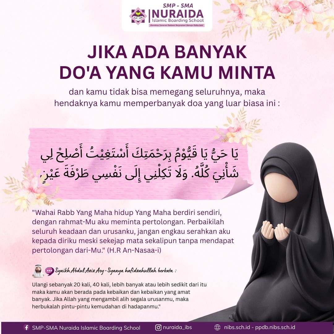 “Wahai Rabb Yang Maha Hidup, Yang Maha Berdiri Sendiri, dengan rahmat-Mu aku meminta pertolongan. Perbaikilah seluruh keadaan dan urusanku…”