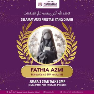 Selamat kepada ananda Fathia Azmi, siswi kelas 9 SMP Nuraida Islamic Boarding School, atas pencapaiannya meraih Juara 3 Star Talks SMP (Lomba Speech) pada event AISC BPIBS 2025.