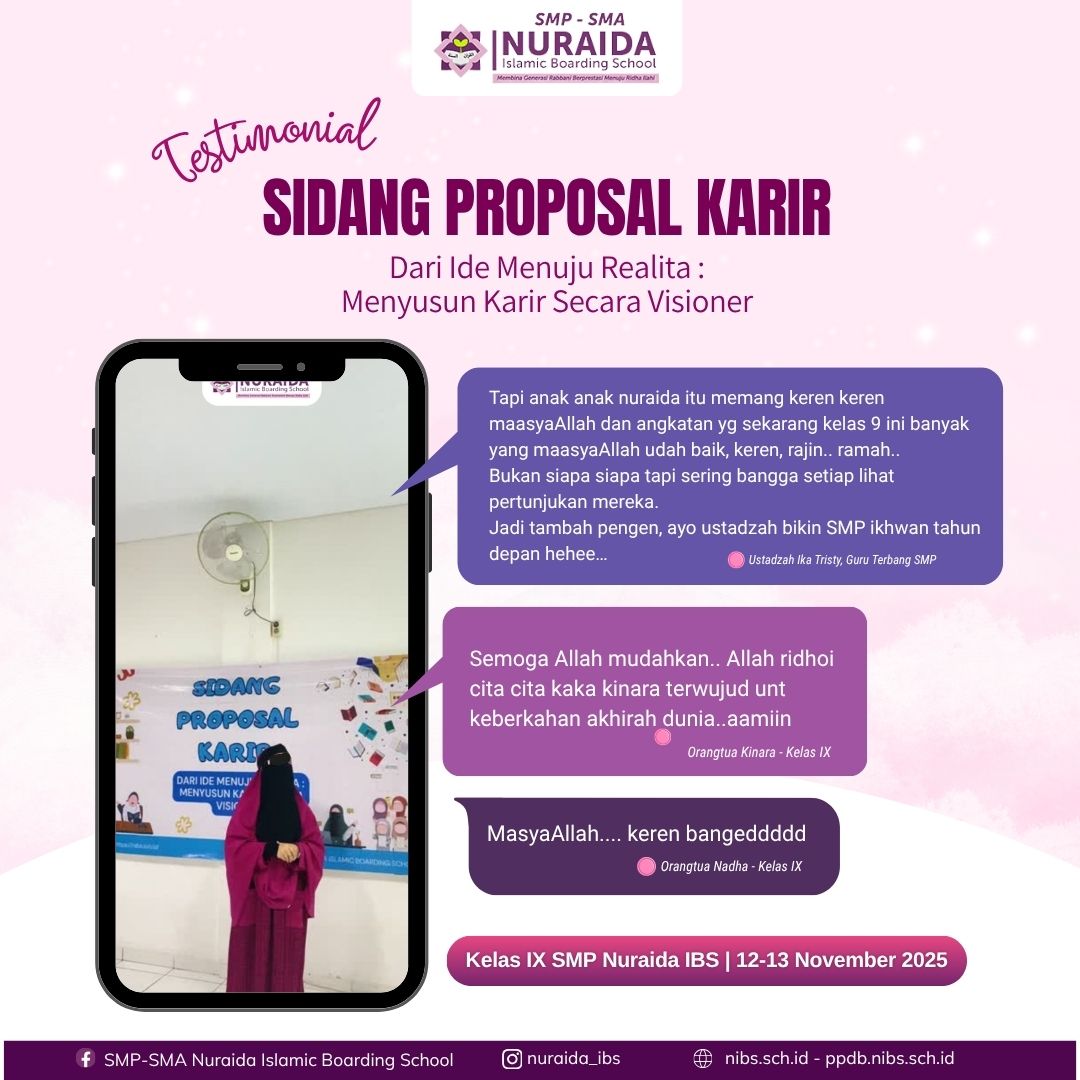 Terimakasih Jazakumullahu Khoiron ummu dan Abu atas testimoni yang diberikan untuk kegiatan Sidang Proposal Kelas IX SMP Nuraida.