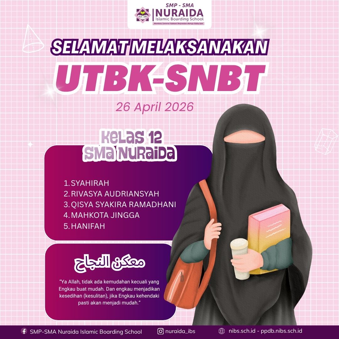 Selamat melaksanakan UTBK–SNBT 2026 untuk thalibah kelas 12 SMA Nuraida Islamic Boarding School 🤍